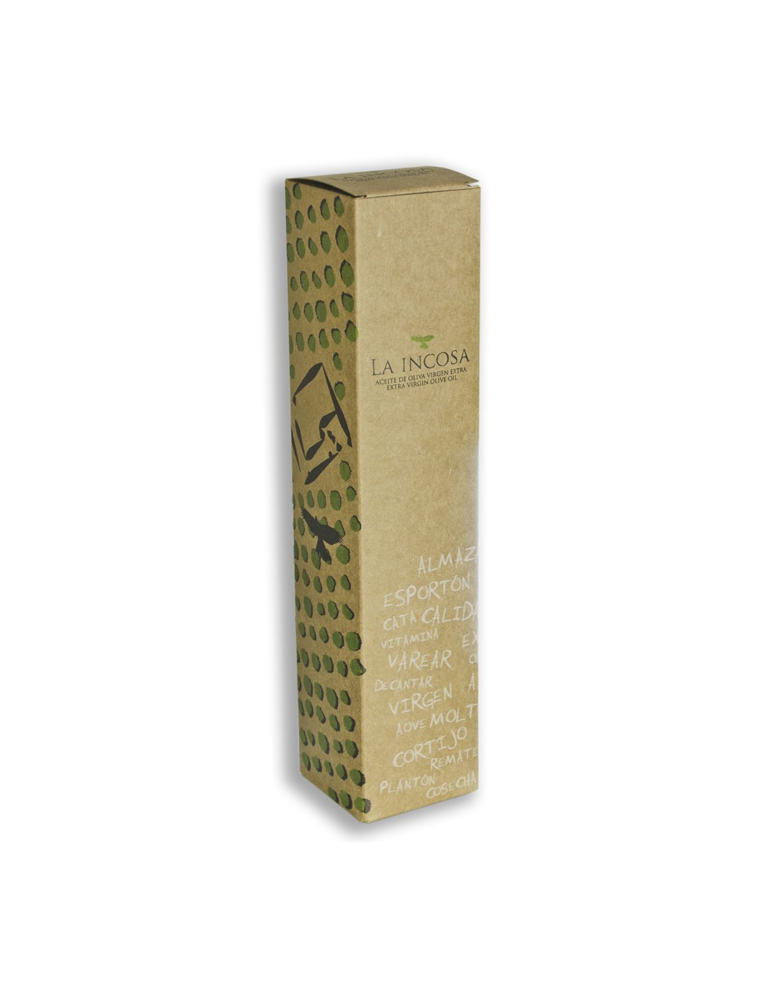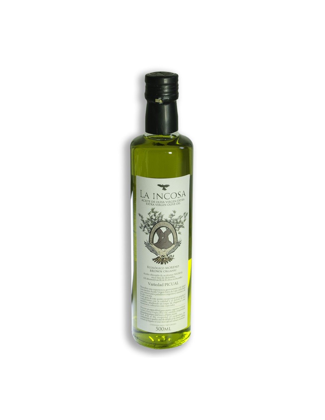 Aceite de Oliva Virgen Extra (AOVE) procedente de aceituna de la variedad PICUAL, de cultivo ecológico y olivar tradicional. Obtenido de la finca La Incosa, en la provincia de Jaén.