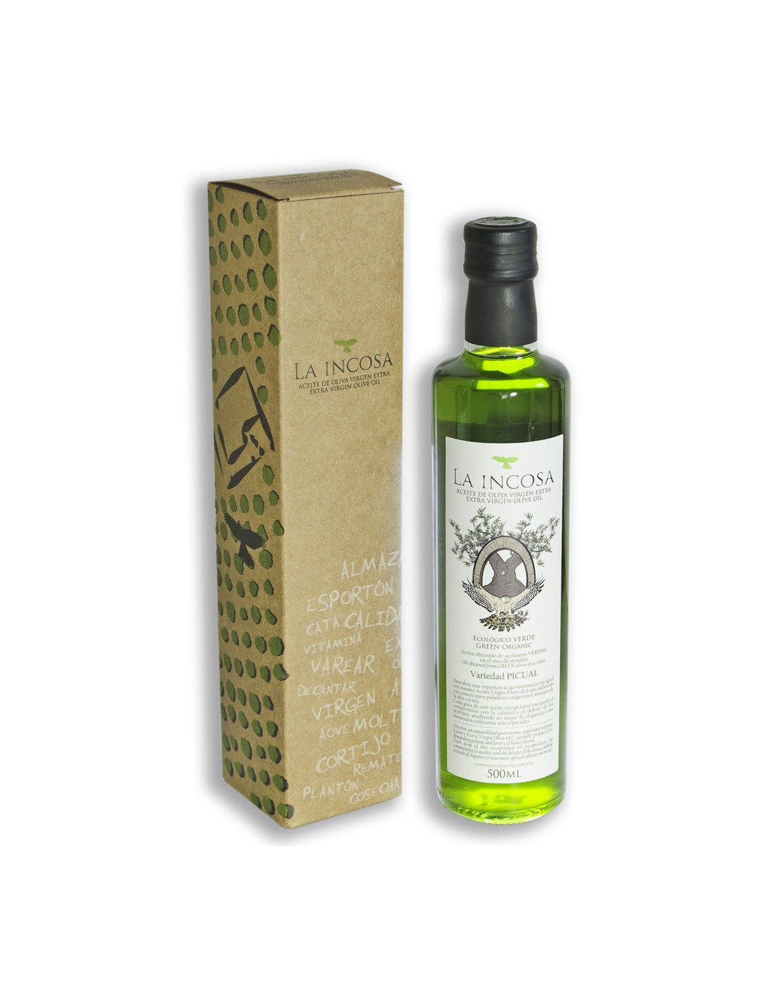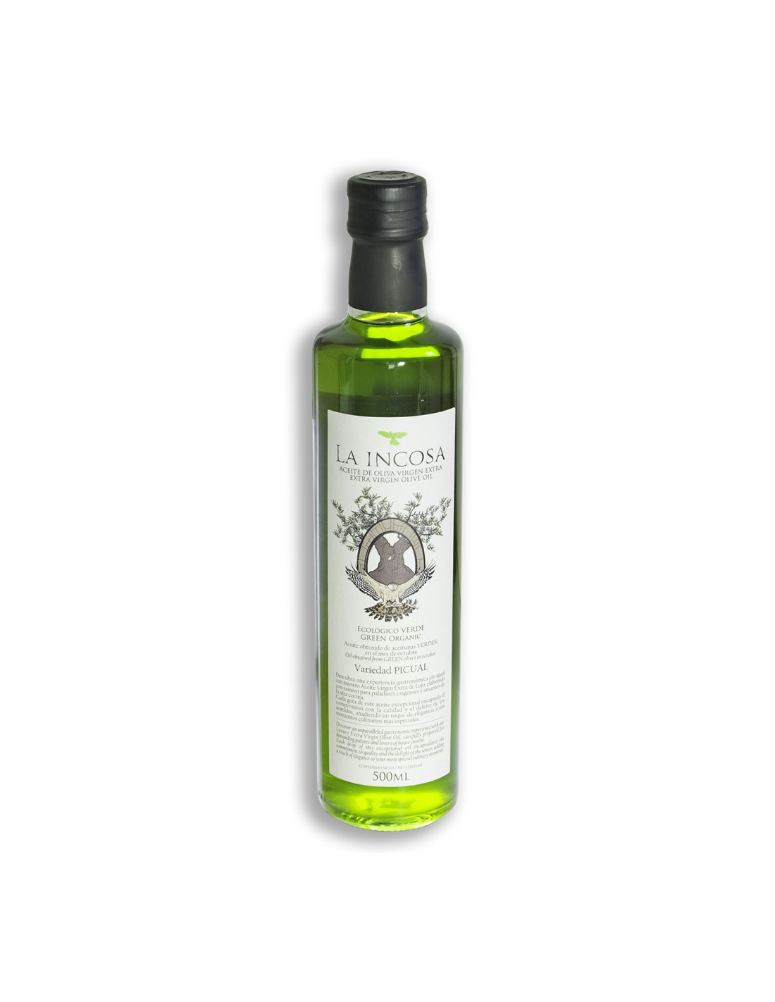 Aceite de Oliva Virgen Extra (AOVE) procedente de aceituna de la variedad PICUAL, de cultivo ecológico y olivar tradicional. Obtenido de la finca La Incosa, en la provincia de Jaén.